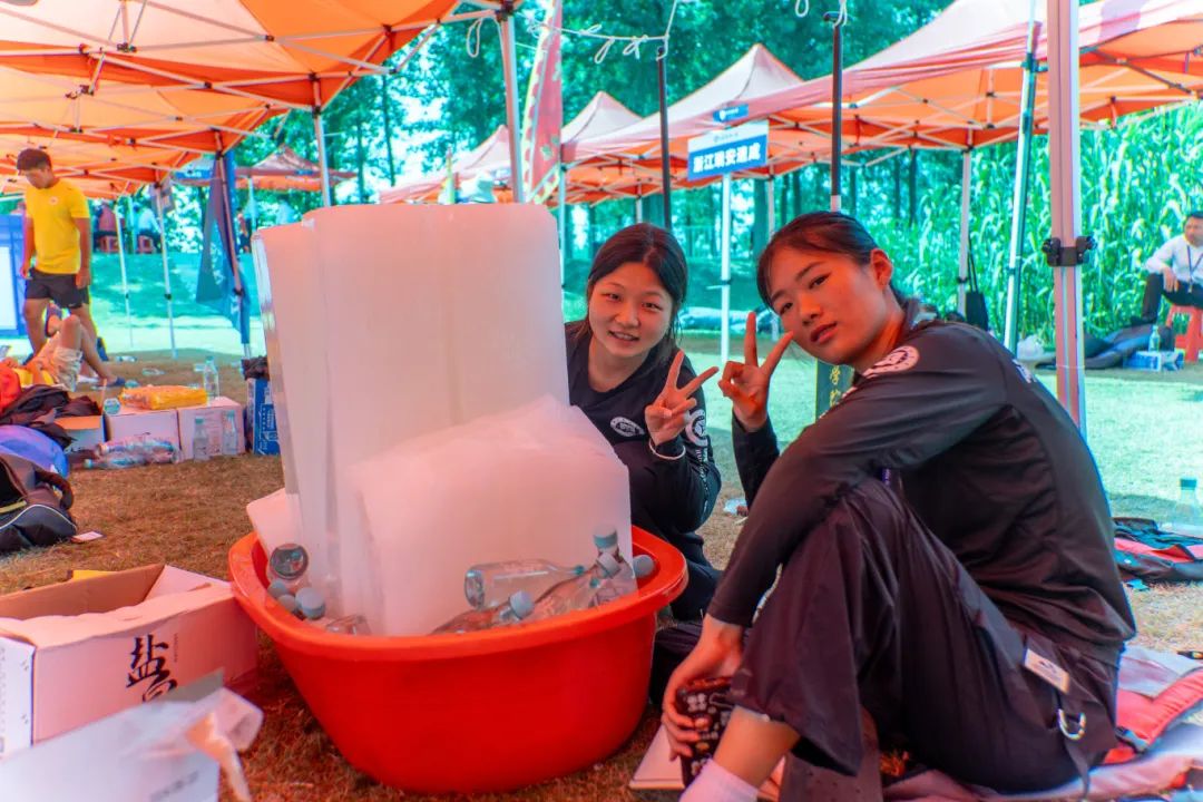 在比赛现场,配备了许多可移动的遮阳棚为运动员们遮阳降温。考虑到天气炎热,防止运动员们中暑,组委会还在运动员休息区安排了10桶共计30块冰块为大家降温。