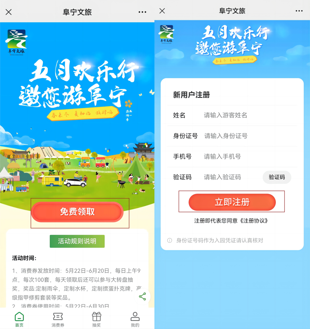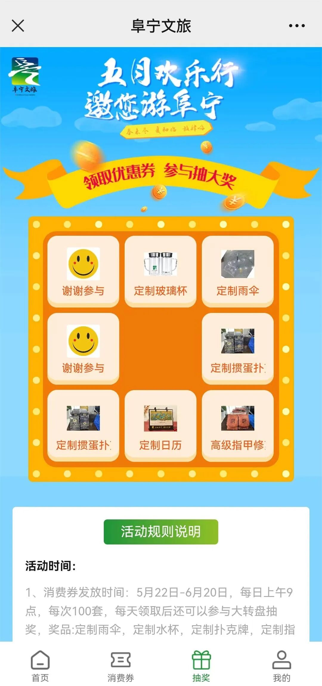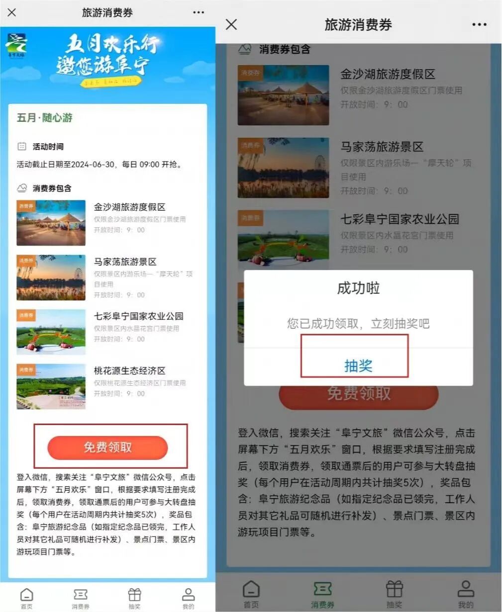 每套文旅消费券包含4张消费券,面值共100元人民币。(具体票价以景区信息为准) 1、面值30元金沙湖门票体验券一张 2、面值20元七彩农业园植物研学馆(原水晶花宫)门票一张 3、面值30元桃花源旅游景区门票体验券一张 4、面值20元马家荡景区摩天轮体验项目一次 1、6月20日前,“阜宁文旅”公众号平台每日上午9点投放100套阜宁免费电子旅游消费券,数量有限,领完即止; 2、电子消费券使用期限:5月22日—6月30日。 文旅消费券领取后还可参与大转盘抽奖,有定制雨伞,定制水杯,定制掼蛋扑克牌,高级指甲修剪套装,定制日历等文旅纪念品。 领取时间:6月22日下午2点—5点 领取地点:阜宁县香港路799号:阜宁县文化广电和旅游局,11楼1106室 咨询电话:0515—82098033 (领取奖品需携带身份证和中奖手机,过期作废) 关注“阜宁文旅”公众号,已关注的点击“发消息”,进入“五月欢乐”子菜单。 进入活动页面,点击“免费领取”,根据线上提示填写姓名、身份证号、手机号、获取验证码完成实名信息登记,点击“立即注册”。 点击“免费领取”,即可免费领取阜宁电子旅游消费券。领取成功后,还可参与“大转盘”抽奖。 奖品内容丰富,有定制雨伞,定制水杯,定制掼蛋扑克牌,高级指甲修剪套装,定制日历等文旅纪念品,等你来抽,祝您好运! 1、活动周期内每个微信号限领1次,大转盘抽奖限抽5次。领取成功的消费券不找零、不兑现,过期作废; 2、文旅消费券仅限在阜宁县指定景区门票或园内项目消费使用; 3、游客线上领取文旅消费券后在景区使用时需主动出示消费券的二维码,经景区工作人员扫码核销后使用。 (本次活动解释权归主办方所有,具体细节以景区为准) 轻舟已过万重山 前路漫漫亦灿灿 愿所有少年奔赴人海 各有灿烂