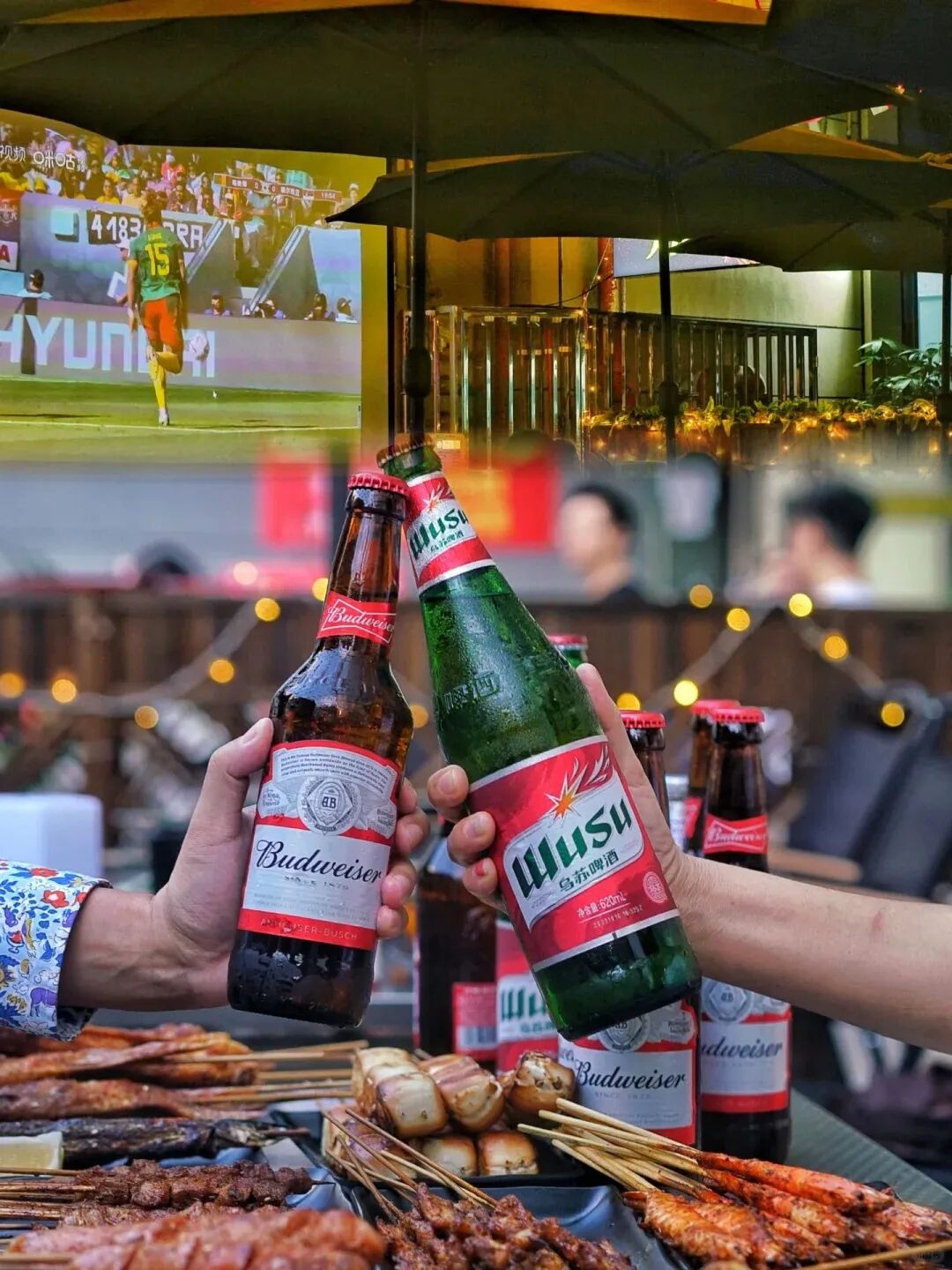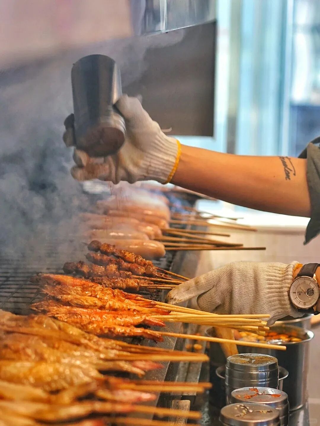 火辣的肉串裹挟着辣椒粉、胡椒粉给予口腔暴爽的肉香和辛辣,举起酒杯且听“噗呲”一声,一口甘冽啤酒,便能让呼吸都充满愉悦。