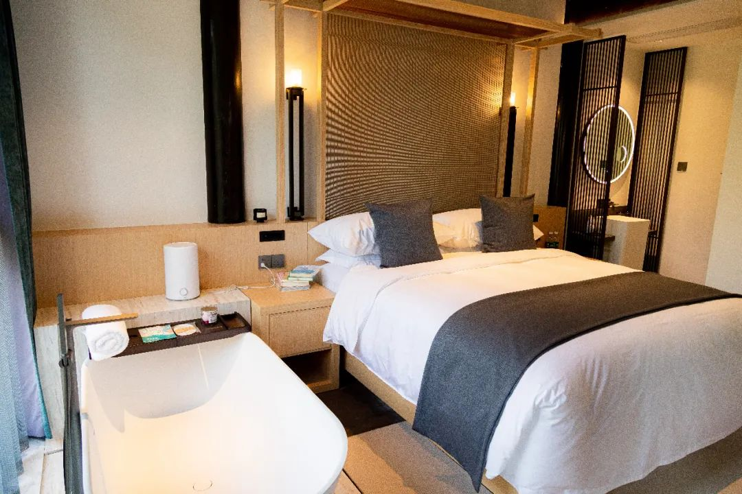 在这里,竹子完全融入了生活的方方面面,客房的床架,房内的桌椅家具。甚至灯罩、牙刷、梳子等小物件全都是竹制品。
