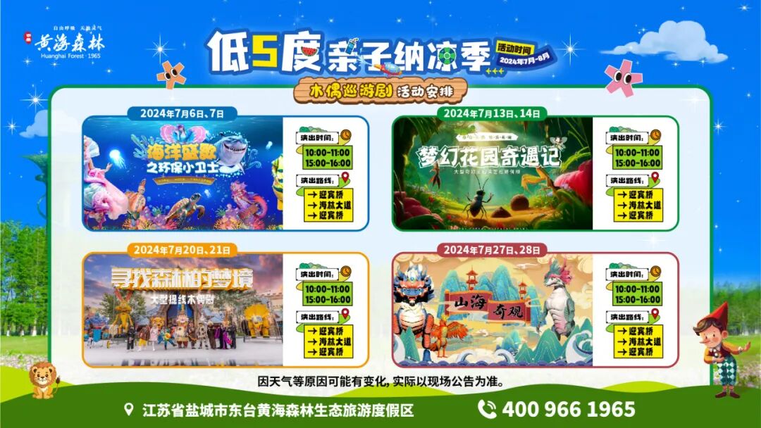 在悠长的夏季时光 常常天马行空 天真浪漫的幻想 伴着繁星涌入梦乡 但这个夏天,不单有梦 黄海森林低5度亲子纳凉季 多种主题儿童舞台剧 多场木偶巡游剧活动 带你走进梦中的魔幻世界 一次穿越时空的奇幻之旅! 巨型木偶剧巡游 已于7月6日开演 多部经典木偶剧作 以巨型木偶为载体 结合现代科技手段 呈现出令人惊叹的视听效果 巡游将在景区内演出 让更多的人领略到木偶艺术的魅力 演出活动路线: 迎宾桥→海林大道→迎宾桥 演出活动时间: 2024年7月13日、14日 10:00-11:00 15:00-16:00 因天气等原因可能有变化 演出活动路线: 迎宾桥→海林大道→迎宾桥 演出活动时间: 2024年7月20日、21日 10:00-11:00 15:00-16:00 因天气等原因可能有变化 演出活动路线: 迎宾桥→海林大道→迎宾桥 演出活动时间: 2024年7月27日、28日 10:00-11:00 15:00-16:00 因天气等原因可能有变化 与巨型木偶邂逅以后 黄海森林国际会议中心 准备了精彩的儿童舞台剧 多种主题剧本接连演绎 带你穿越不同的魔幻世界 7月10日 14:58开抢早鸟票 早鸟票38元起 数量有限 先抢先得 如果你想知道 生活在童话世界里是什么感觉? 魔法师将带大家进入怎样的世界? 礼物盒里将会出现什么? 两把凳子如何引发“世纪之战”? 梦幻的泡泡如何俘获你的童心? 童话的大门应该如何开启? 那就快来《小丑时光机》 带你进入梦幻的童话世界 演出活动地点: 黄海森林国际会议中心一楼水杉语厅 演出活动时间: 2024年7月18日 16:00-16:40 2024年7月18日 20:00-20:40 2024年7月19日 16:00-16:40 2024年7月19日 20:00-20:40 跟随多萝西飞跃彩虹,穿越到神秘的奇境森林! 完成游戏挑战,获取神奇的魔力元素! 2米高巨型铁皮人空降演出现场! 现场互动游戏环节!123木头人!千万不要被稻草人发现哦! 搞怪有趣的花朵精灵,带你揭开奇境森林的神秘面纱! 奇境森林里究竟有什么秘密?等你同我们一起去探险! 演出活动地点: 黄海森林国际会议中心一楼水杉语厅 演出活动时间: 2024年7月20日 16:00-16:45 2024年7月20日 20:00-20:45 2024年7月21日 16:00-16:45 2024年7月21日 20:00-20:45 很久很久以前,有一个古董收藏家,被称为蒸汽先生,他痴迷于收集蒸汽时代的各种东西,其中有一组蒸汽木偶躺在他的柜子里,那里有各种有趣的想法和不可思议的挑战。相传,只要拨动开关,就能打开这个世界的大门,让这个疯狂而又充满欢乐的童话世界重新焕发生机。而这里是梦开始的地方... 女士们先生们欢迎来到疯狂蒸汽世界。 演出活动地点: 黄海森林国际会议中心一楼水杉语厅 演出活动时间: 2024年7月23日 16:00-16:40 2024年7月23日 20:00-20:40 2024年7月24日 16:00-16:40 2024年7月24日 20:00-20:40 观众将会跟随艾尔莎女王一同进入神秘的仙冰雪仙境,体验一场身临其境,如梦似幻般的冰雪之旅! 一起学习神奇的魔法!获得由公主颁发的专属魔法棒!帮助艾尔莎女王共同对抗邪恶的黑暗势力! 美妙动听的经典旋律,曼妙绚丽的动感舞姿,让我们一起尽情高歌热舞! 魔法森林里究竟有什么秘密?等你同我们一起去探险! 演出活动地点: 黄海森林国际会议中心一楼水杉语厅 演出活动时间: 2024年7月25日 16:00-16:40 2024年7月25日 20:00-20:40 2024年7月26日 16:00-16:40 2024年7月26日 20:00-20:41 疯帽子遇到了天大的困难 爱丽丝决心帮助这位朋友 让我们一起进入梦游仙境 帮助爱丽丝渡过难关 演出活动地点: 黄海森林国际会议中心一楼水杉语厅 演出活动时间: 2024年7月27日 16:00-16:40 2024年7月27日 20:00-20:40 2024年7月28日 16:00-16:40 2024年7月28日 20:00-20:41 心动不如行动! 抢票最全攻略在这里