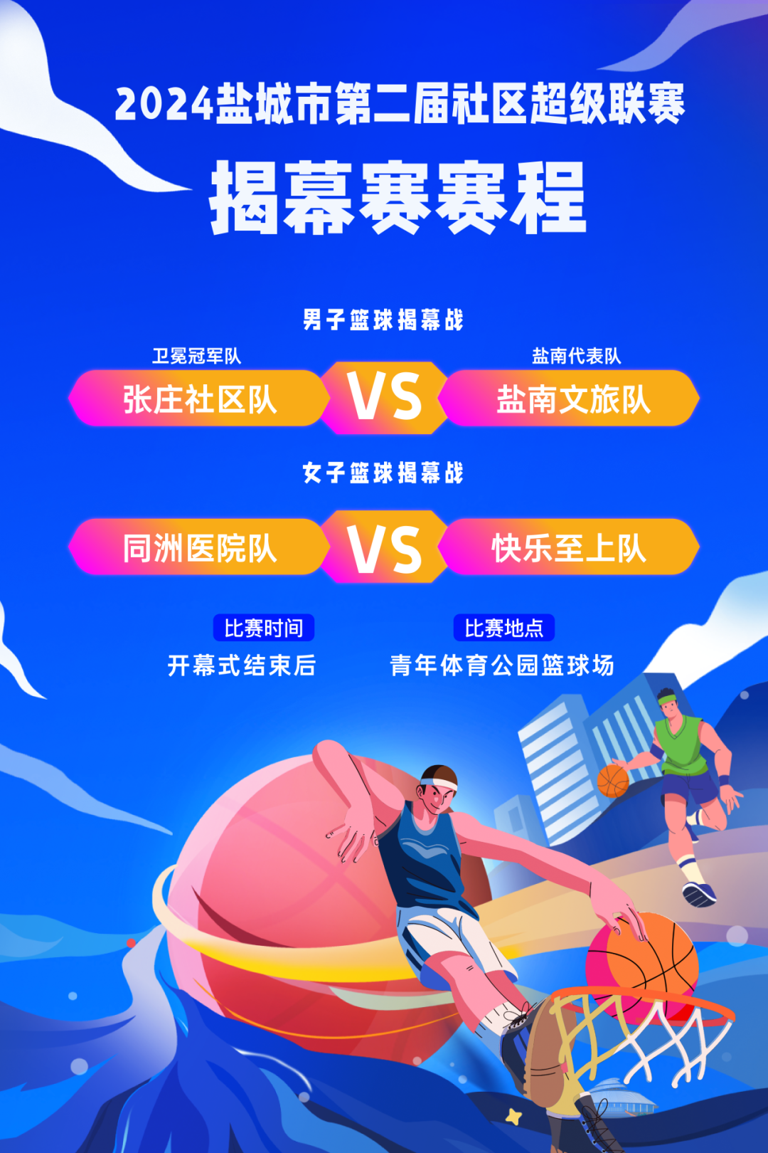 两位篮球界的重量嘉宾 将亲临社超联赛开幕式现场 为现场的球迷们带来精彩表演赛 并为现场及线上观众带来专业赛事讲解 开幕式现场 伴随着律动十足的音乐及炫酷的灯光 来自大丰区、盐都区、亭湖区 经济开发区及盐南高新区五个代表队的运动员 将身着各色服装迈着铿锵有力的步伐 昂首挺胸入场,述说他们参赛的决心和勇气
