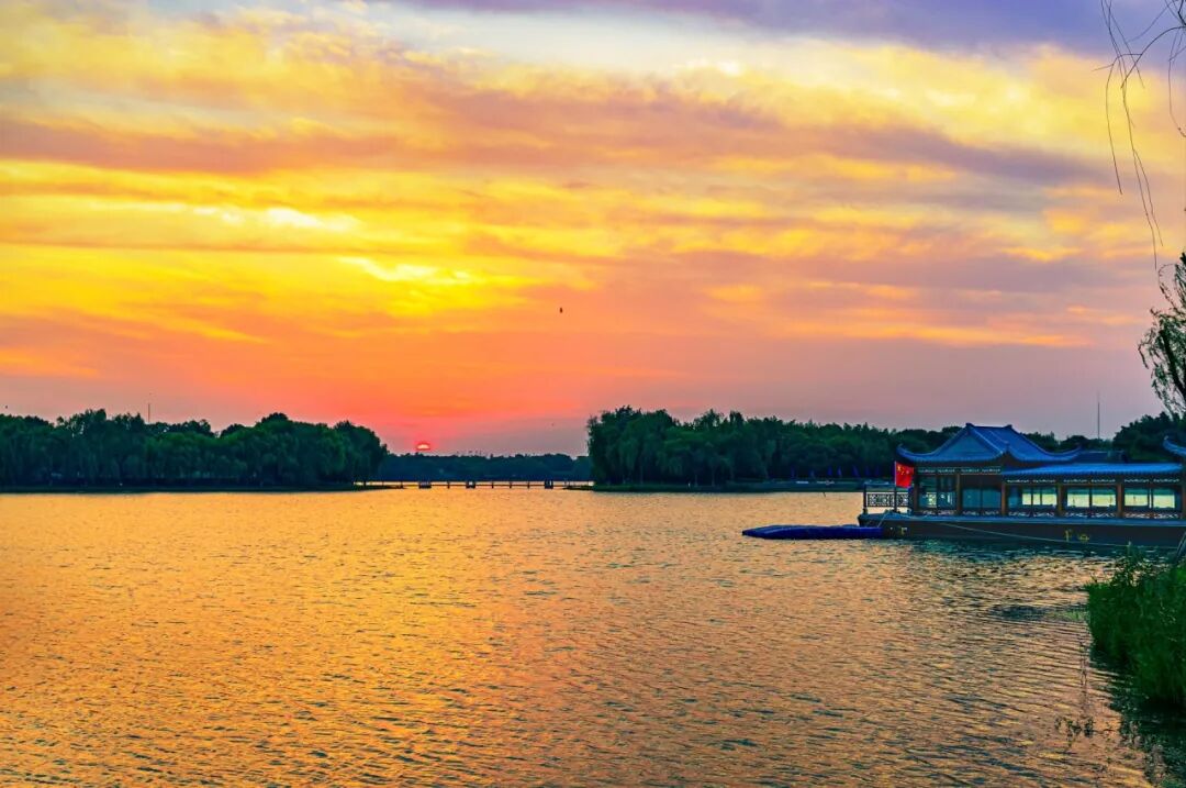 天空、湖面逐渐被染成金黄色