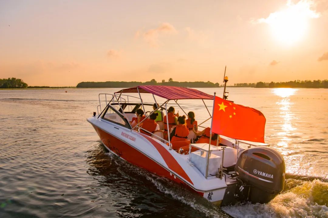 乘上快艇,近观鸿雁伴飞,远看夕阳西下