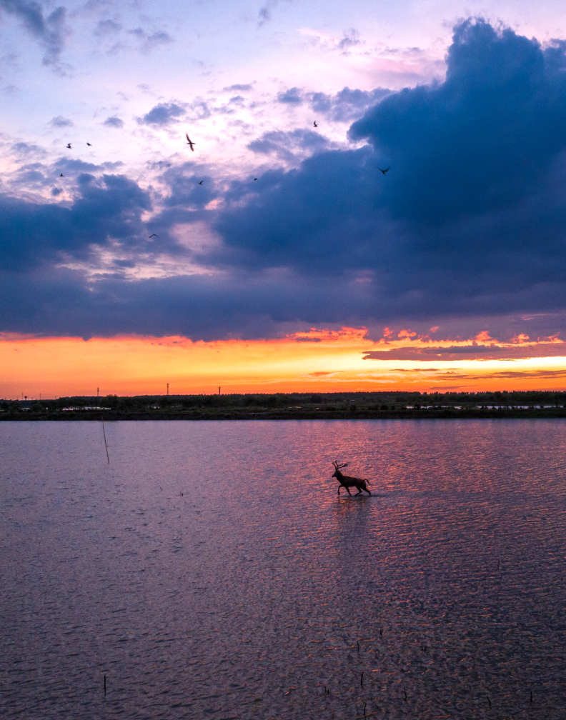 傍晚时分,大丰的天空更是变幻莫测,美得让人心醉。夕阳如血,将天际染成一片绚烂的橙红,云朵被镶上金边,仿佛是大自然最精致的工艺品。此刻,湖面或湿地成了天空之镜,倒映着天空的万千色彩,水天一色,分不清哪里是天,哪里是地。麋鹿漫步其间,成为了这幅浪漫画卷中最温馨的一笔。