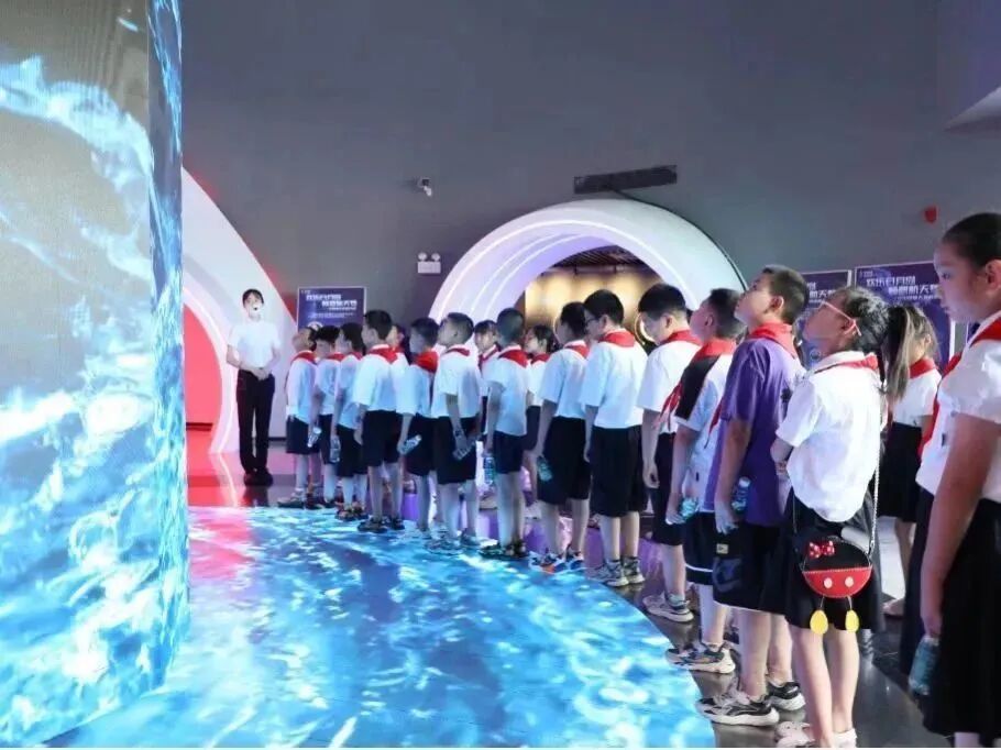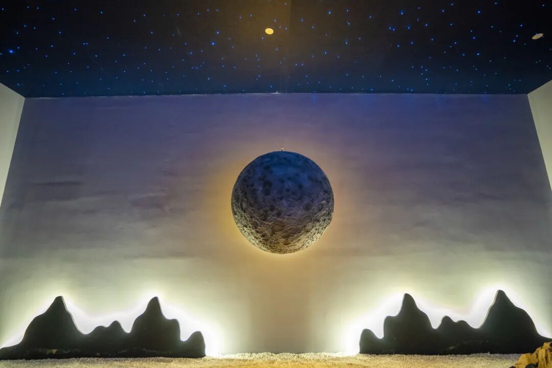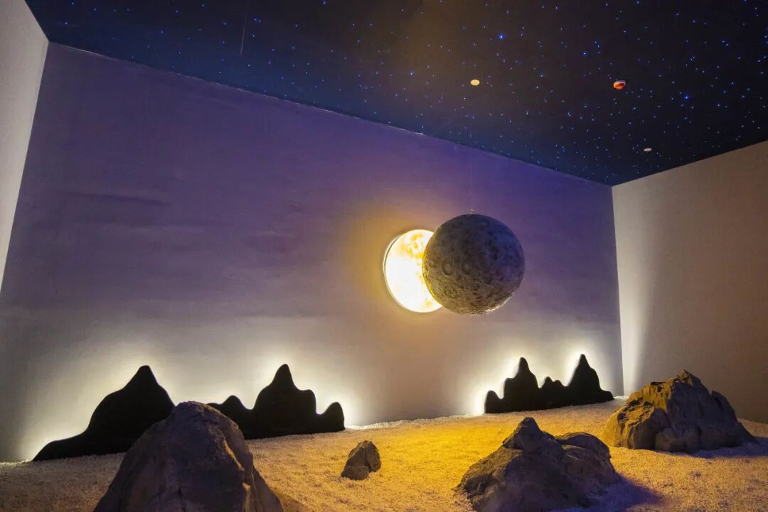 日月畅想主题馆布展面积约为3000平方米,共分为上下两层,一层为太空体验馆、二层是月球餐厅。 采用体感互动、VR、数据可视化、生物识别等各类先进的展示手段,构建沉浸式科普空间体验环境,打造多感官探索之旅。 日月畅想主题馆融入了丰富的研学活动,为学生们打造了一个寓教于乐的学习平台。在日月畅想馆内,学生们仿佛置身于浩瀚宇宙之中。