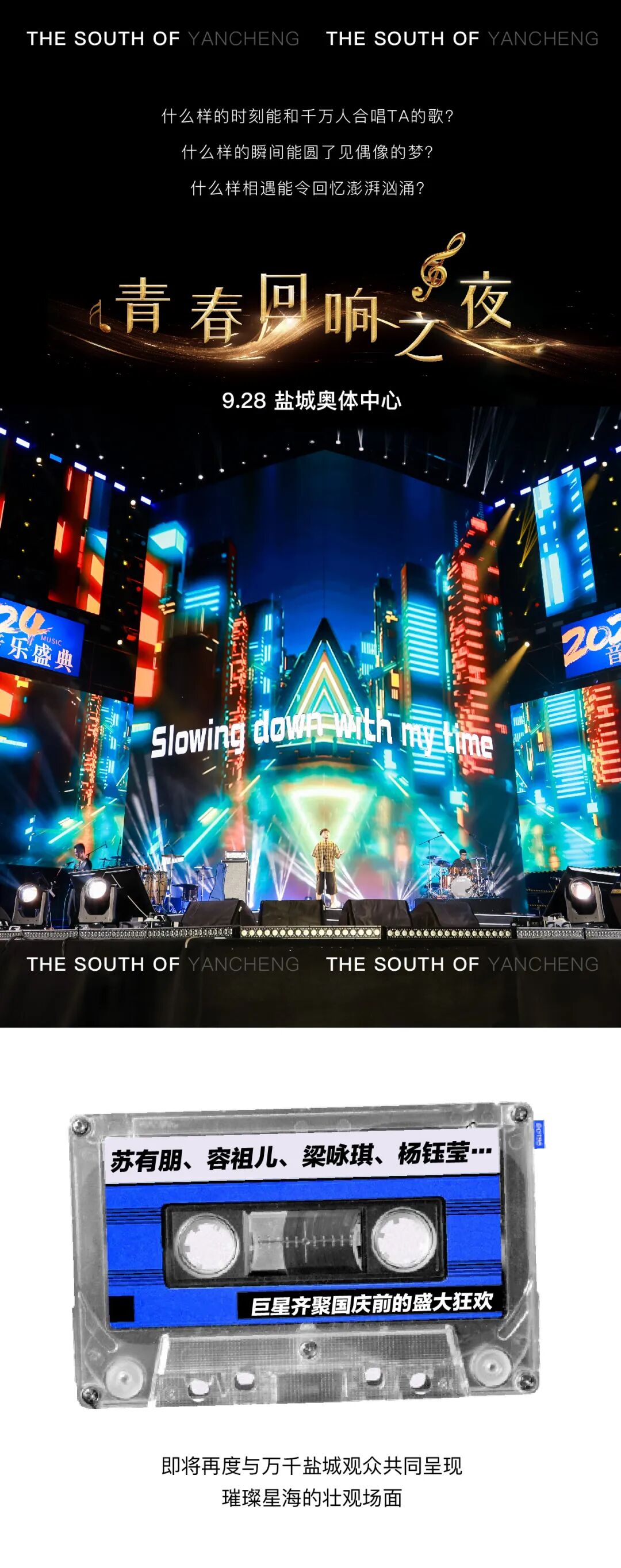 世间所有的相遇都是久别重逢。虽是初见,但已经是在某个时刻聆听过的声音。9月28日,青春回响,时光依旧,盐城奥体中心等你。 THE SOUTH OF YANCHENG Let's go 盐城奥林匹克体育中心 盐城奥林匹克体育中心(简称“盐城奥体中心”)总占地513亩,总建筑面积约19.4万平方米,包含一场三馆一园,一场为体育场,三馆分别为综合馆、游泳馆和艺术馆,一园为儿童体育公园。项目总投资约24亿元,是盐城市的标志性建筑群,可承办省级综合比赛赛事和国家级单项比赛,场馆建设标准和规模在江北堪称一流。