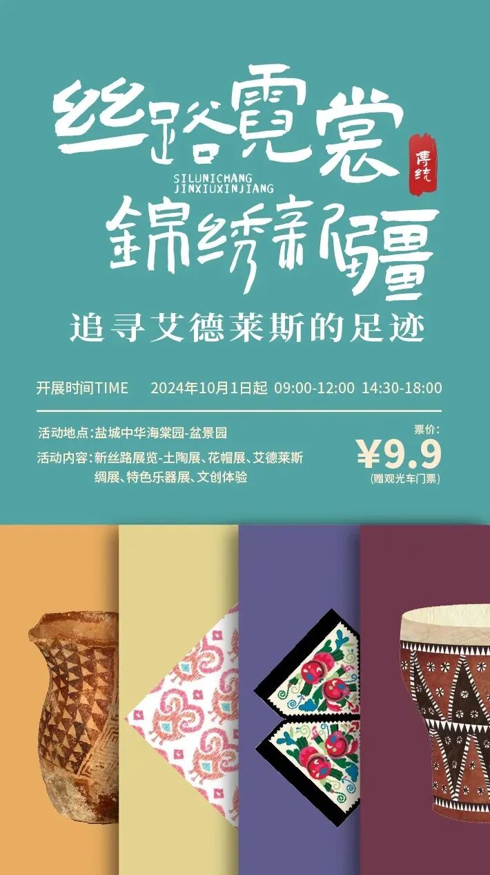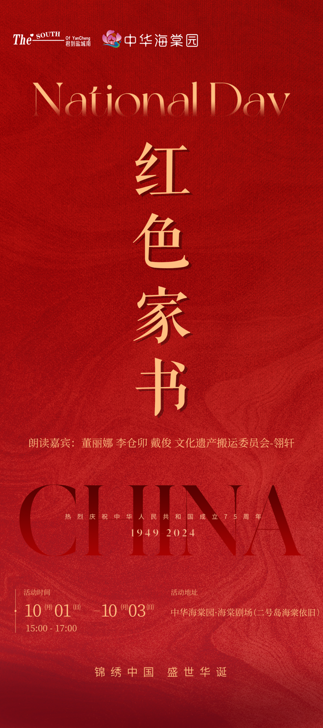 这里不是新疆 却有木卡姆奏响的旋律和土陶文化的震撼人心 假期在家门口的“阿勒泰” 重走丝路,寻找艾德莱斯的足迹 「丝路霓裳·锦绣新疆」展静待您的光临 活动日期/Time 2024年10月1日-10日30日 活动地点/Adress 盐城中华海棠园盆景园 购票方式/Way 点击上方图片购票 纸短情长绕不过挂念二字 万语千言,总关乎家长里短 海棠剧场国庆特别企划活动——红色家书 活动日期/Time 2024年10月1日-10日3日 15:00——17:00 活动地点/Adress 盐城中华海棠园·海棠剧场