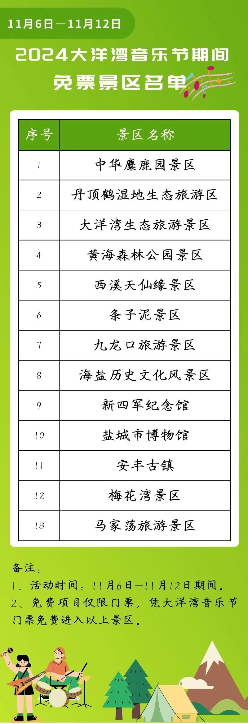 2.在11月6日至11月12日,大洋湾、中华麋鹿园、黄海森林公园等13家4A级以上景区免门票(具体方案请向下滑)