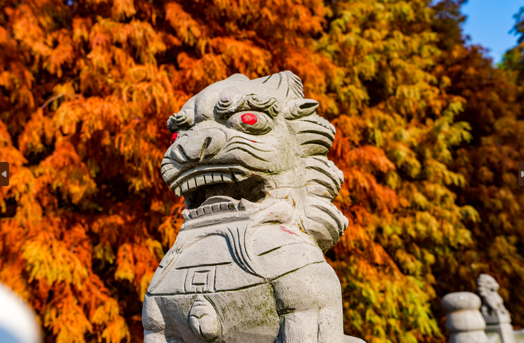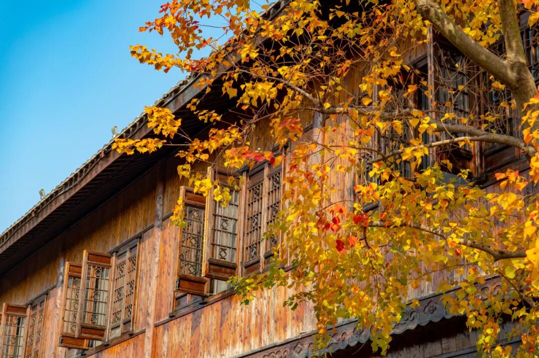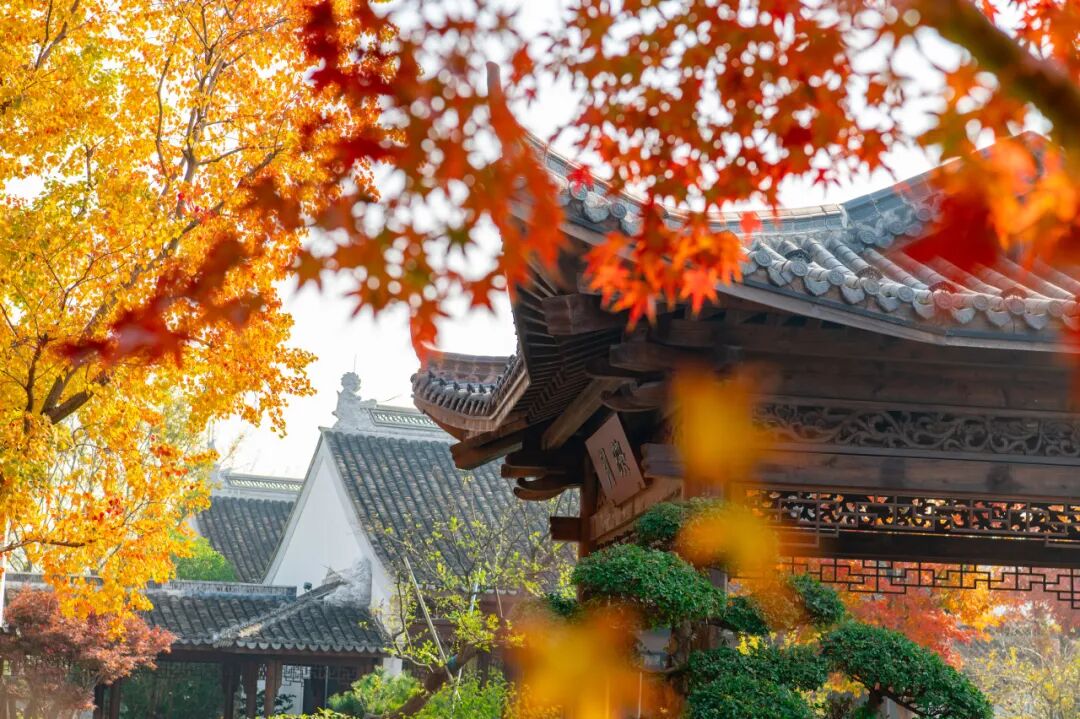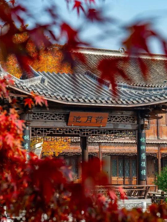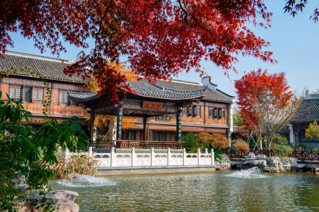 枫叶如同秋天绽放得最浓艳的烟火,红枫与东晋水城亭台楼阁相互映衬,构成了一幅美丽的秋景图。