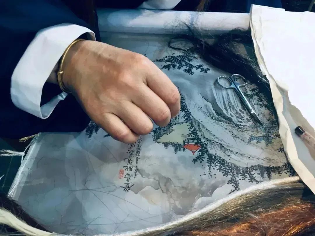 东台发绣以丝绢为底,以绣针为笔,以精选的少女天然色发做绣线,精工绣制而成,耐腐防蚀,利于收藏,被誉为"天下一绝"。