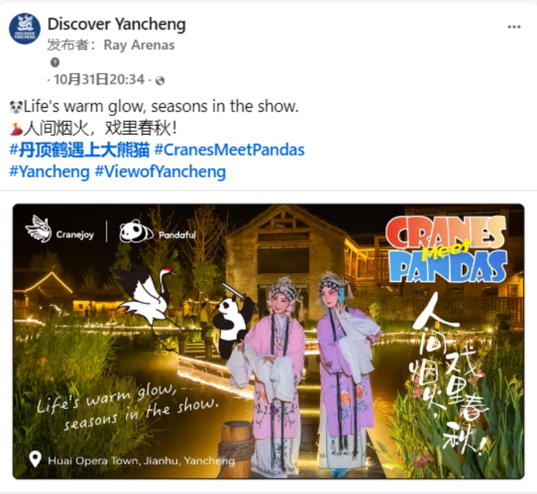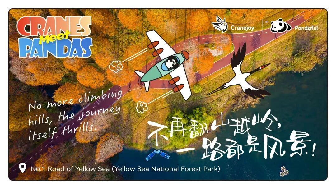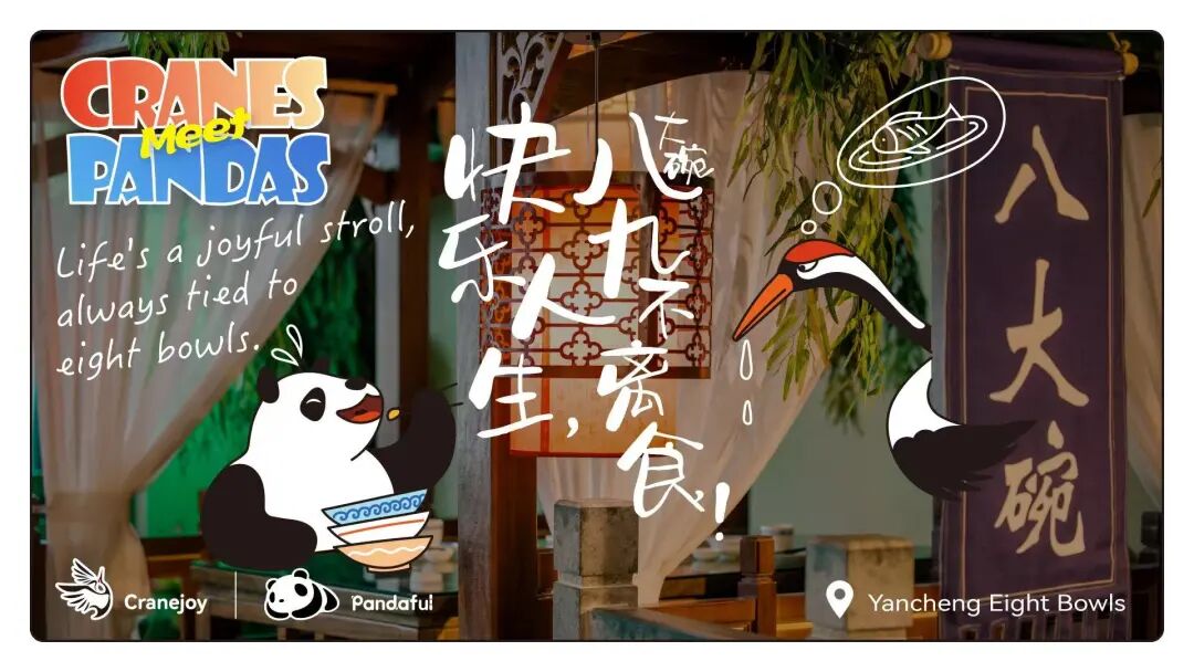 熊猫与丹顶鹤相逢之际,奇妙游历间,盐城地标美景俯拾皆是。跨界游记海报里,丹顶鹤与大熊猫化身灵动使者,穿梭于中华麋鹿园的旷野自然,痴迷于丹顶鹤湿地生态旅游区的美景宝藏,流连(燕舞)大纵湖剧工厂熠熠生辉的舞台,沉醉于盐城八大碗的美食盛筵,又因美景“沉醉”在大洋湾生态旅游景区的粉色樱花海中。