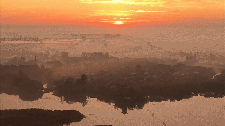 稳稳站在水荡成片的芦苇梢上,秋风吹动芦花,日出随之奔跑。柔柔的光泻下来,仿佛太阳奔跑留下的残影,为古香古色的砖瓦房镀上一层华丽的金黄。