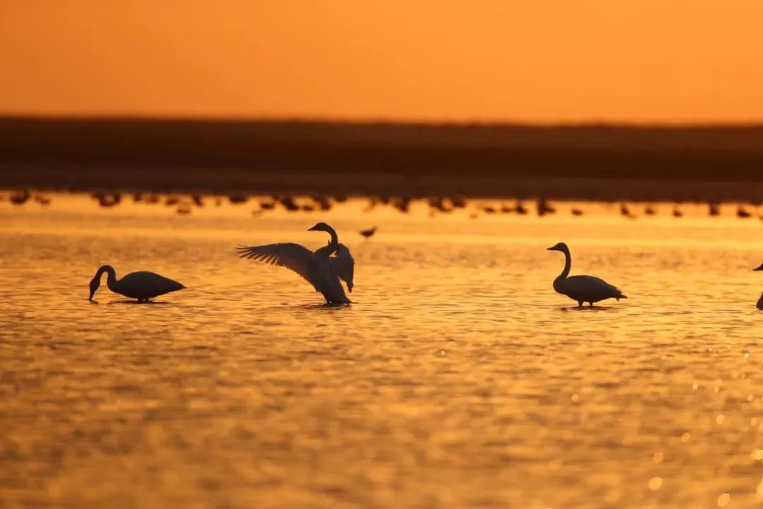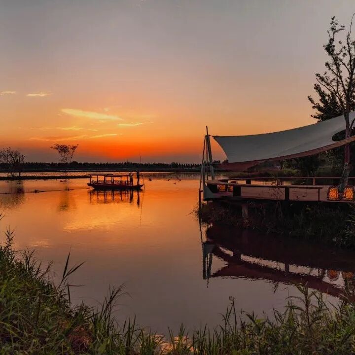 日出便如同一枚熟透的果子,缓缓坠入无边湖泊,漫天的彩霞与橙光,“吻”着湖面上道道波纹。