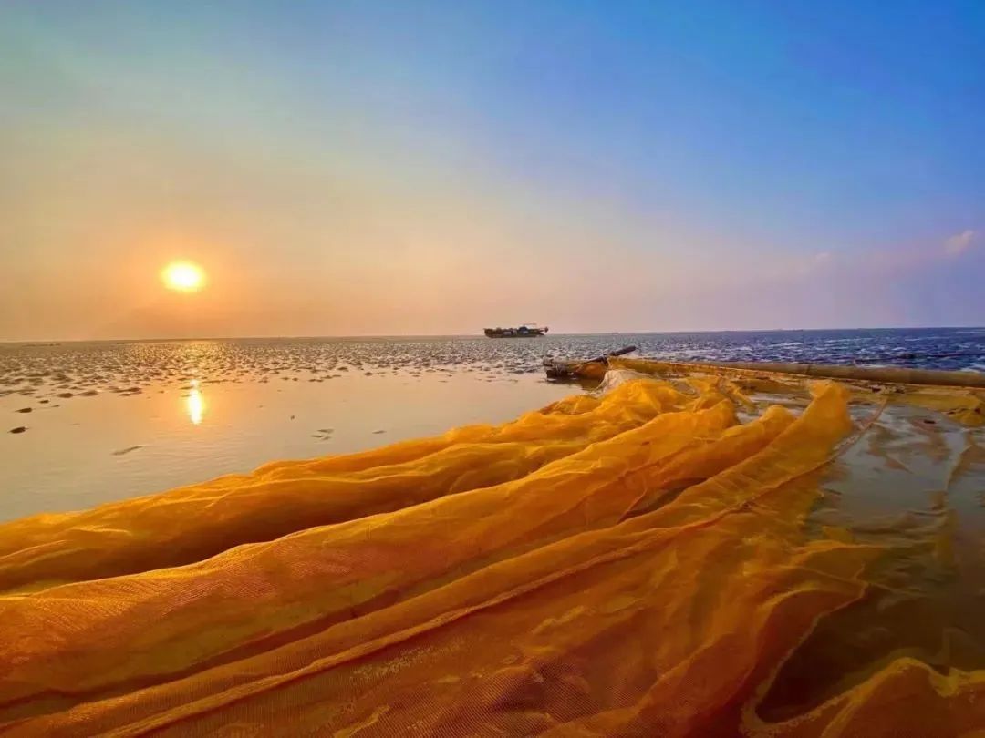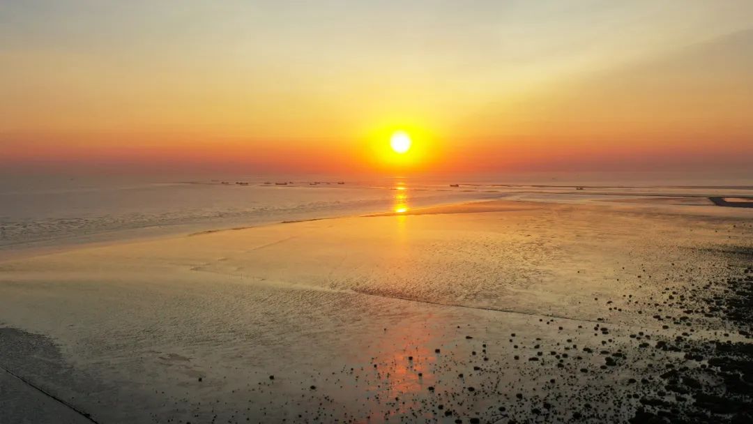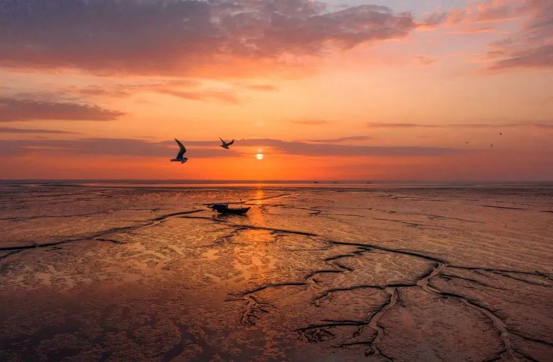 野鹿荡日出最大的魅力,在于滩涂连接的海平面无限广阔,从朝霞到日光都霸气的铺满整个海面。