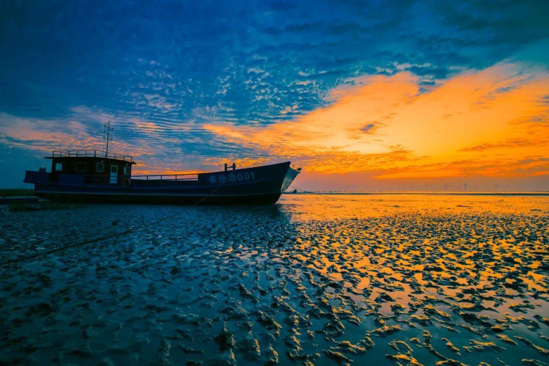 破晓时分的条子泥湿地上,一只搁浅的船儿,一棵参天的潮汐树,天空中偶尔扑簌飞过的鸟......