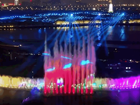 美轮美奂的灯光秀以水、岸、桥、廊为幕,以光影为笔,结合水幕喷泉,在浪漫的星空下变幻出盐南的各大标志性建筑。
