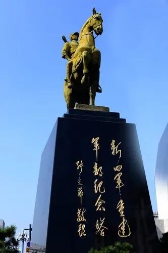 盐城市最显著的城市地标与精神的象征——大铜马雕像。一位年轻英武的新四军战士映入大家眼帘,他身背大刀,手握缰绳,骑在高扬前蹄的战马上,昂首前进。