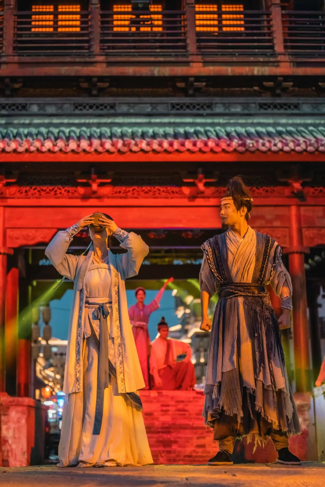 到了夜晚,《相约伍佑》表演队坎坎而来,身着古装的演员们在街道上行走如云,摆手互动。