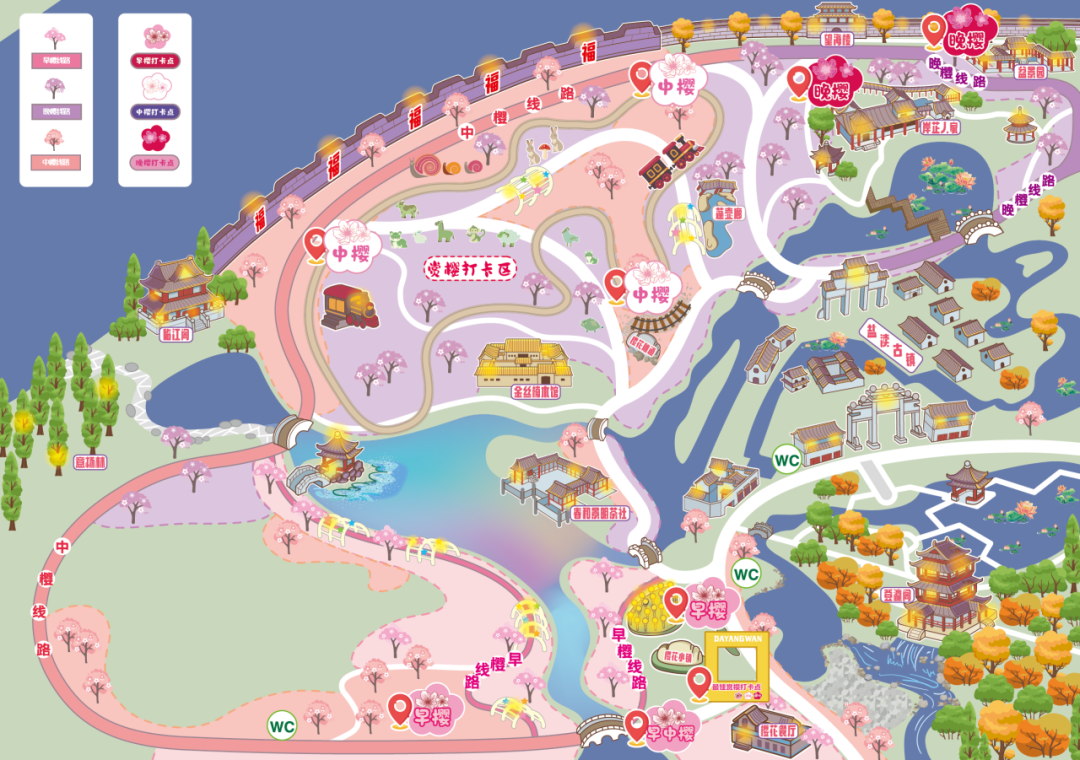 为方便您更好地欣赏早、中、晚樱的不同风姿,我们为您准备了一份详细的樱花园赏樱地图。该地图清晰标注了各类樱花的分布区域,助您赏樱不迷路。