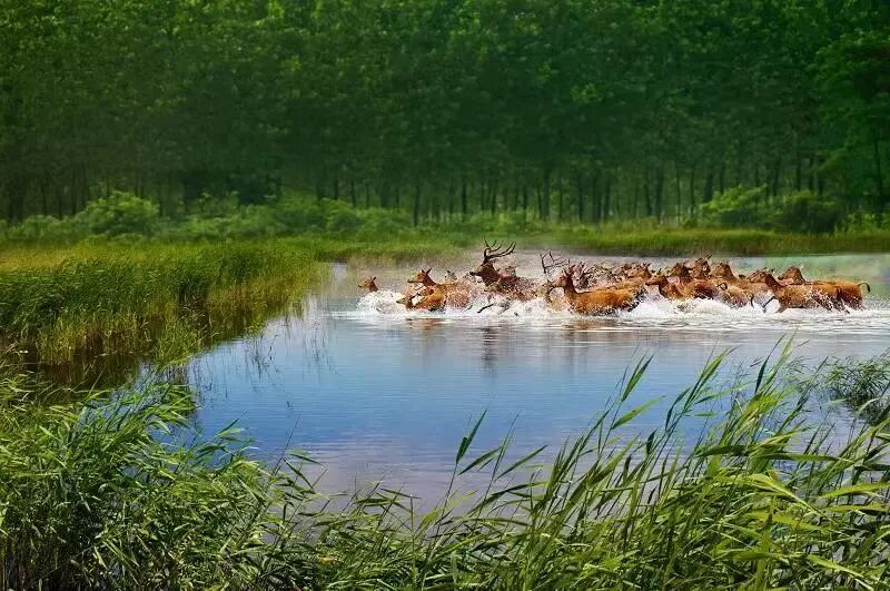 中华麋鹿园——全球唯一以“湿地生态、麋鹿保护”为主题的国家5A级旅游景区,也是世界上面积最大、种群数量最多的野生麋鹿园,近万头麋鹿追逐欢腾,让人有非洲动物大迁徙的即视感。每年初夏,为争夺王位,雄鹿们强悍对决,上演“鹿王争霸”,演绎物竞天择。