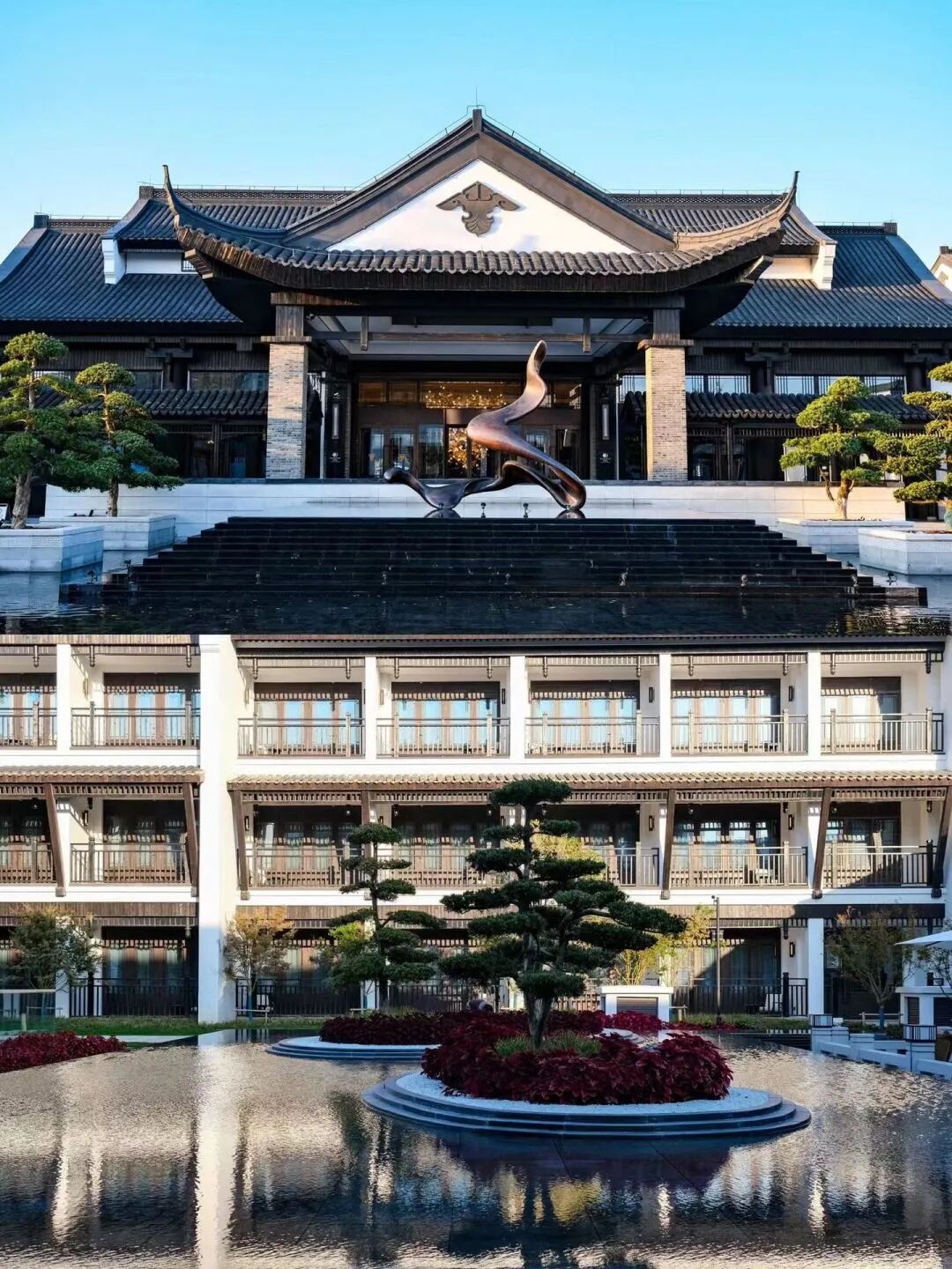 亭台楼阁,葳蕤潋滟,山水庭院,自成天地。清澈的湖面宛若碧绿琉璃,两只黑天鹅与数十尾锦鲤悠然嬉戏,泛起涟漪阵阵。琼花瑶草,芝兰生香,住在盐城大洋湾希尔顿逸林酒店,仿若住进梦中仙境。