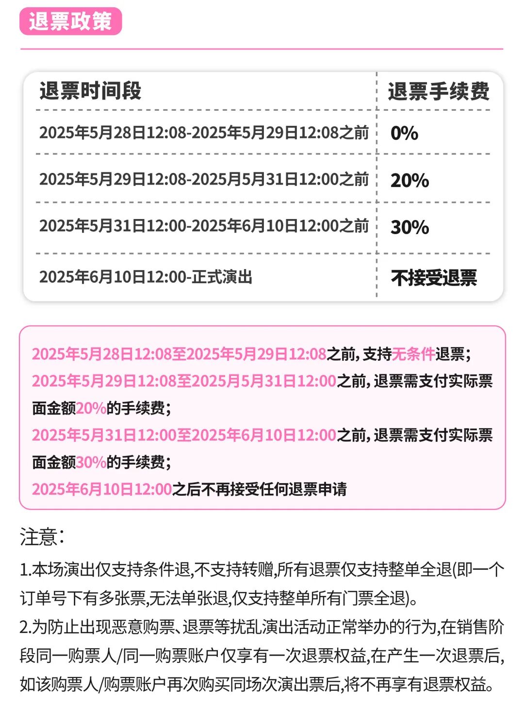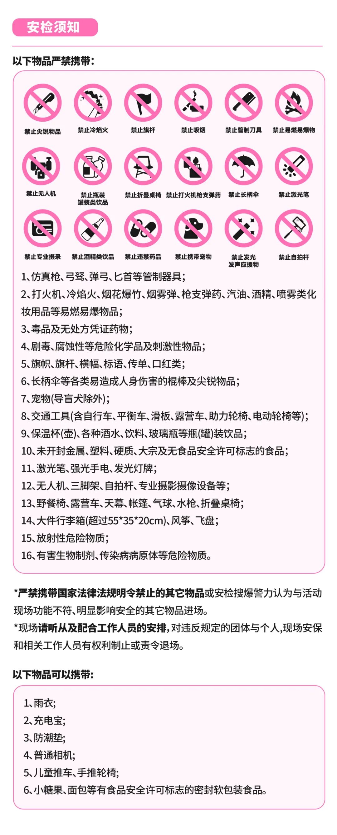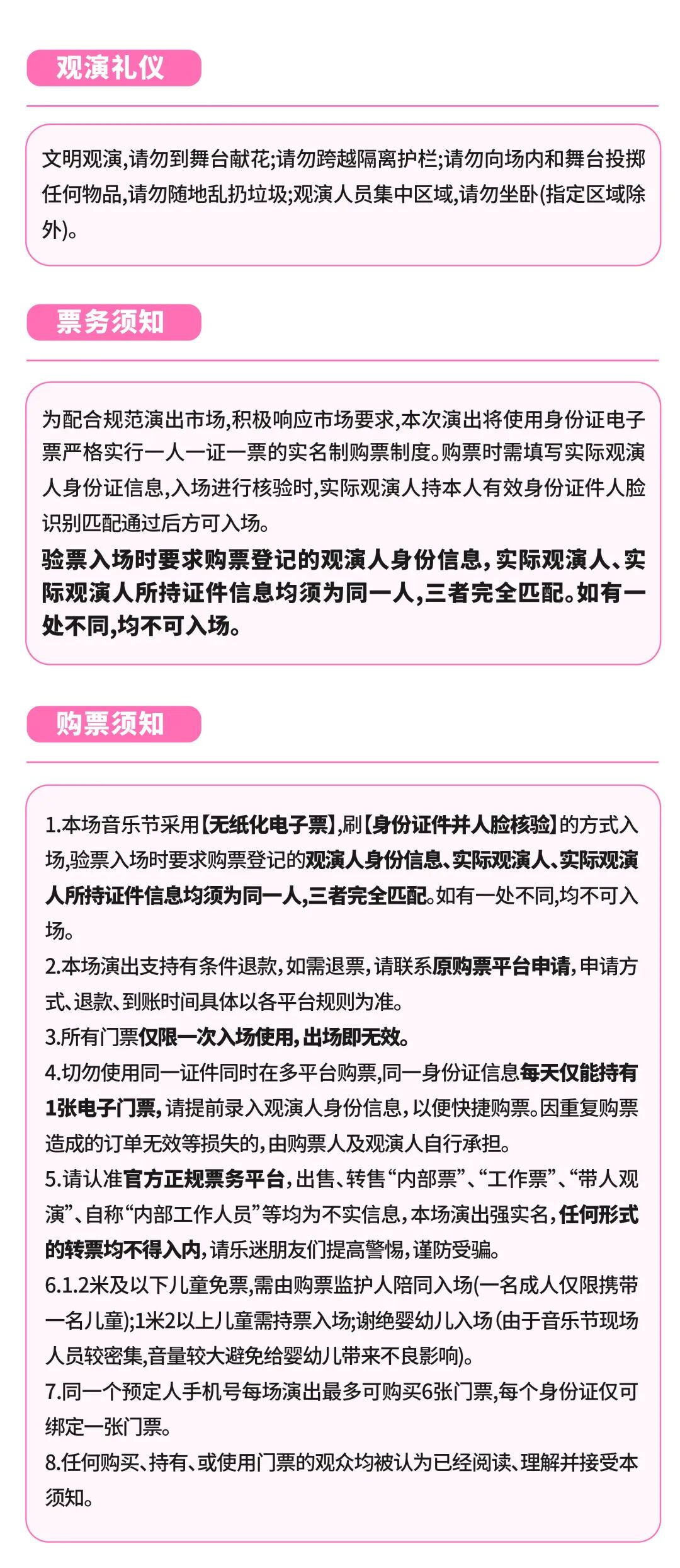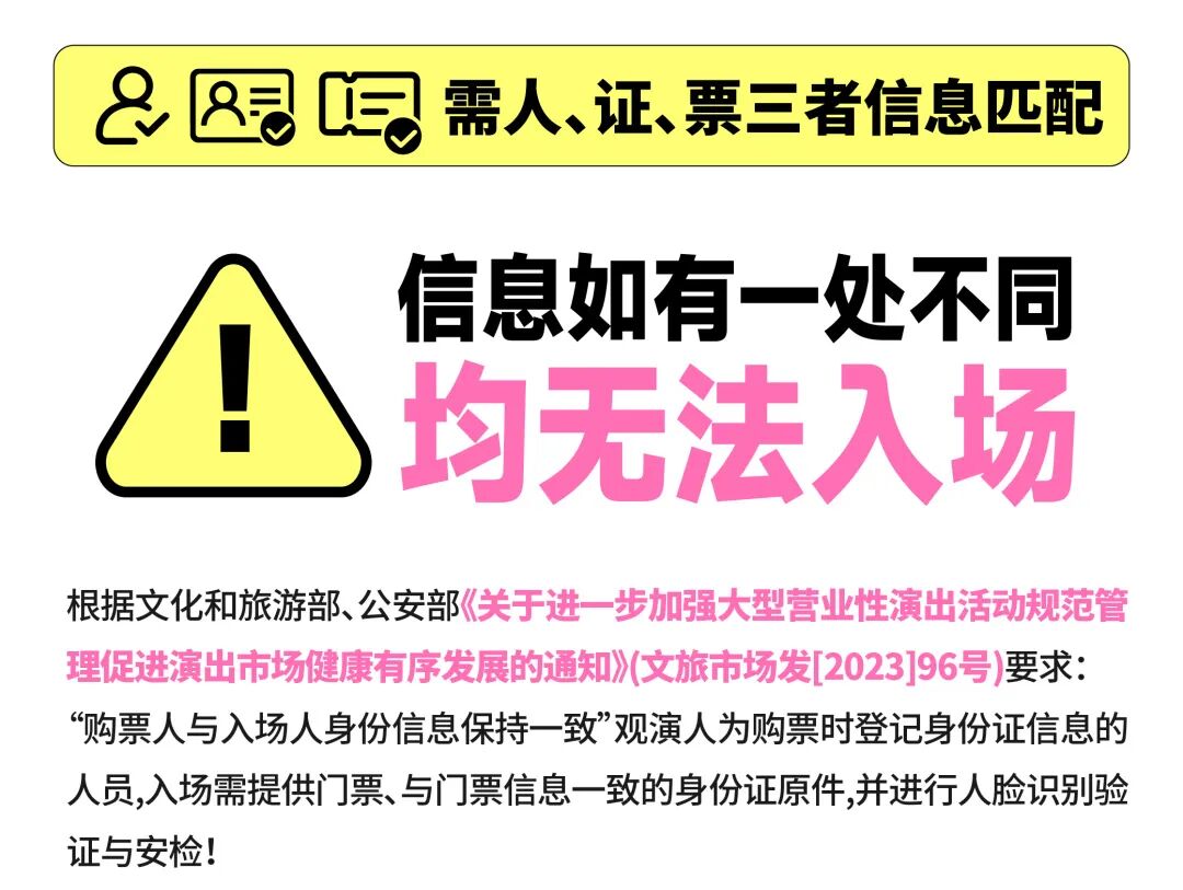 • 本次演出,官方没有发布过任何形式的渠道赠票、低价票、工作证等,也未与任何非【官方购票平台】的公司或者个人开展票务合作。任何以上名义或类似名义销售门票、有偿制作工作证、有偿明星合影的均为欺骗行为。