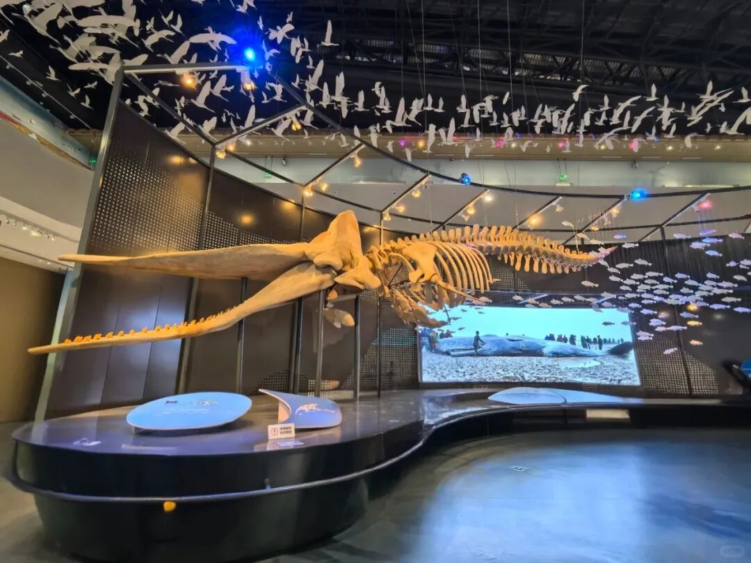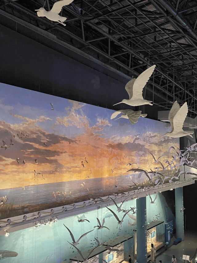 头顶上是成群结对迁徙的候鸟,旁边是搁浅盐滩13米长的鲸鱼骨架,身后是缕缕行行跟随的鱼类……黄海湿地博物馆用场景与科技为我们构建了一个个震撼的自然场景。