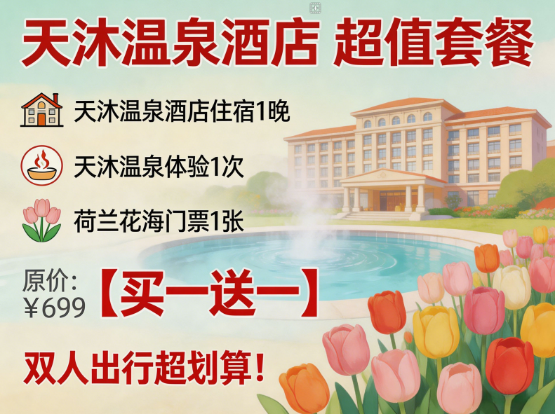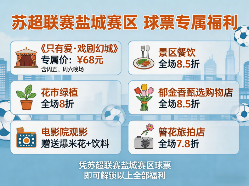 福利内容:凭宿迁市民本人身份证,即可免费畅游大丰11家旅游景区!免费仅限景区大门票,不含景区内演艺、夜游等二次消费项目福利内容:凭4月25日苏超联赛盐城赛区球票,同样免费畅游大丰11家旅游景区!看球赏花两不误,一张球票解锁双重快乐免费仅限景区大门票,不含景区内演艺、夜游等二次消费项目指定酒店:天沐温泉酒店、北苑酒店、花海全季酒店、喆啡酒店、大龙岛度假村球迷专享:持盐城主场比赛电子入场券,享携程当日划线价半价入住,大龙岛按998元半价计费宿迁市民专享:凭本人身份证,享携程当日划线价八折入住,大龙岛按998元八折计费天沐温泉酒店住宿1晚+天沐温泉体验1次+荷兰花海门票1张,原价699元,现【买一送一】,双人出行超划算!1、《只有爱・戏剧幻城》仅需68元(含周五、周六晚场)