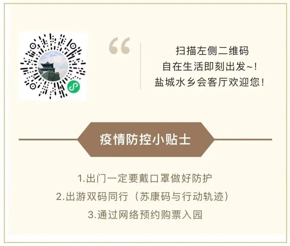 Day1: 大纵湖景区-七子岛-落霞湖码头游船-古芦舟-网红喊泉-鹦鹉表演-勇闯芦荡迷宫-柳堡村-鸿雁放伴飞-水陆战车-田园烧烤-浑水摸鱼-拓展射箭-七子桥-《印象大纵湖》灯光秀-《九九艳阳天》水秀-《对决》表演-夜宿开元酒店
