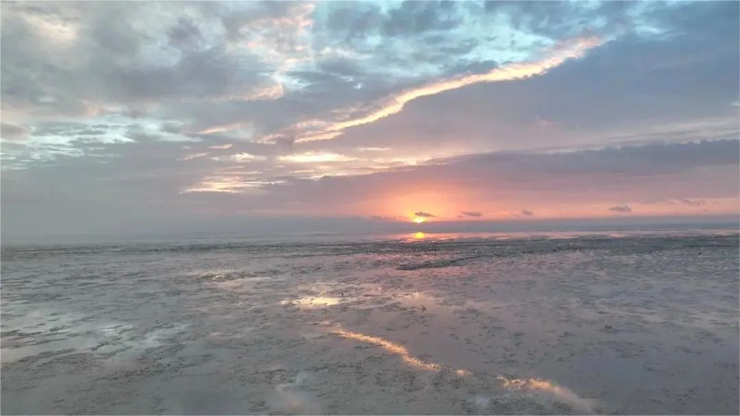 川东新闸北转进入黄海之滨,沿着海韵路一直开,到达日出海湾。日出海湾是大丰野鹿荡日出的最佳观赏点。