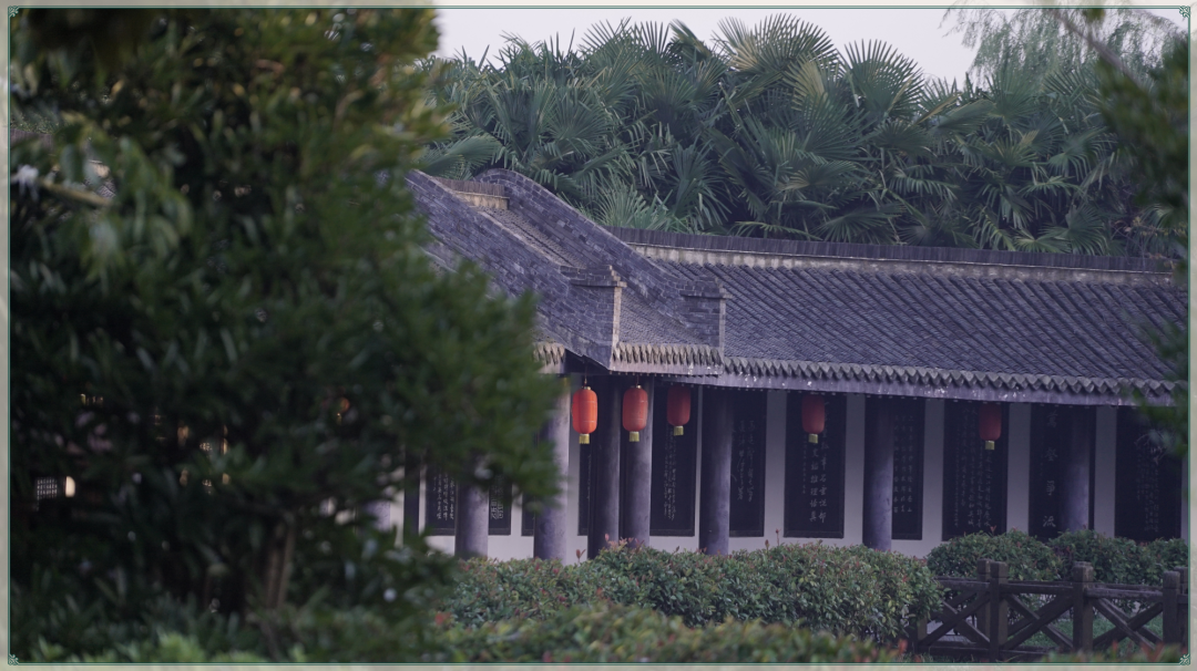 林子里隐隐约约地掩映着亭台水榭。而那一排排整齐的碑林,笔笔酣畅,亦是行云流水,洒脱奔放。