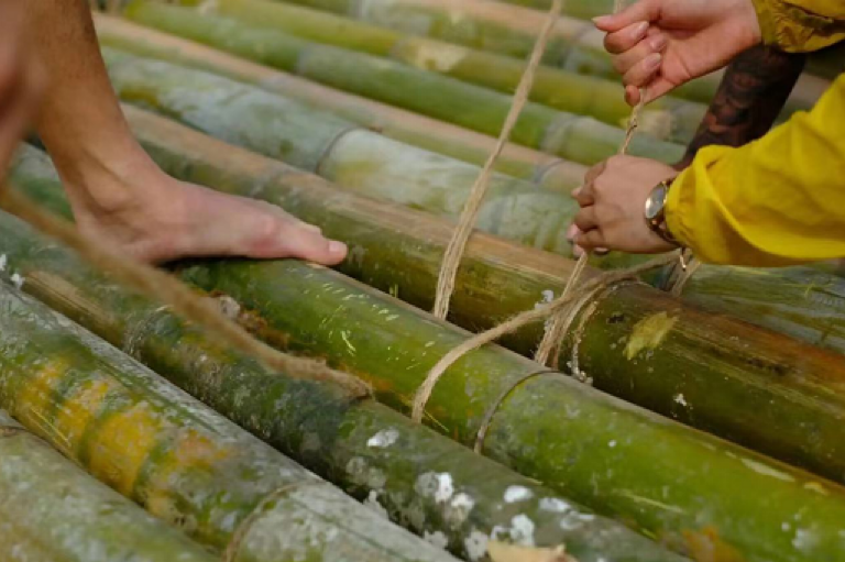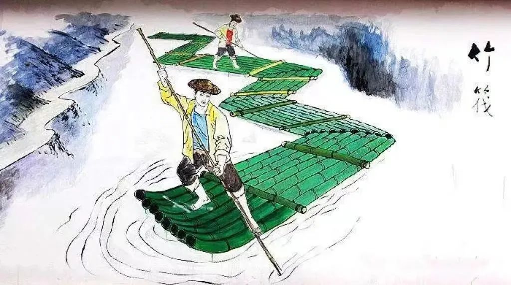 竹筏,也叫竹排。竹筏用真竹配加刺竹捆扎而成,小筏用5~8根竹,大筏用11~16 根 。一般的竹筏长约三丈,宽数尺。竹子的粗端做筏头高高翘起,细端做筏尾平铺水面。