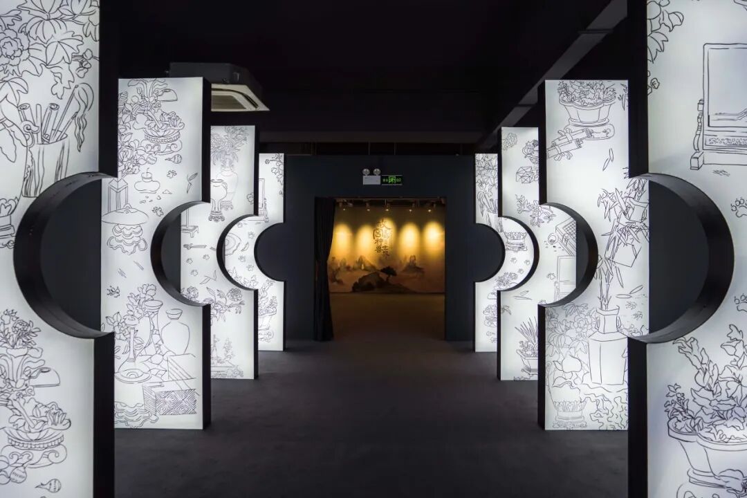 四组巨大的屏风上生活着一只传说中的“食铁兽”,就是神兽貘(mò)。它是一种黑白花的“长鼻怪”,长得丑萌丑萌的。在日本,人们相信貘能穿越梦境,吃掉可怕或悲伤的梦,守护睡梦中的人。