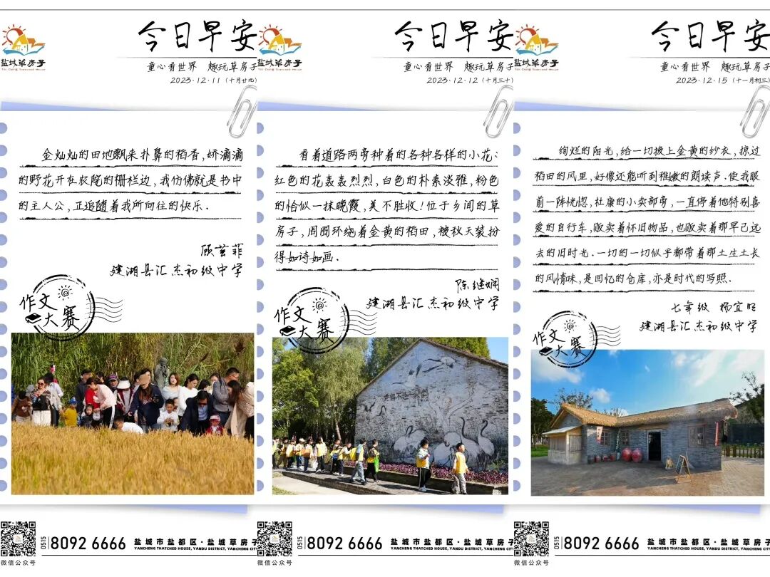 No.08 3月,春暖花开的出游季,草房子住进了春天里。这里不仅有「花花」世界迷人眼,还有迎着东风肆意生长的孩子们。偷偷告诉你,全盐城的中小学生都来了。 No.09 4月3日,百辆房车开进了草房子。被生活掏空的人,最快的回血方式就是来草房子听一场民谣音乐会,周艳泓、娇子、水木年华,陪你点亮星空和晨曦。 No.10 平等地羡慕每一个来露营的人,草地烧烤香得直窜鼻尖。每到周末,总有特种兵突袭而来。 No.11 4月19日,曹文芳老师的新书发布会和大家见面了。本月,西乡文学社挂牌仪式、2023全民阅读书香盐城主题展、世界读书日研学活动纷纷落地草房子。爱读书人士纷纷发出惊呼:真好! No.12  4月下旬,十万只风车来到草房子,将这份热爱阅读的风越吹越盛。铺天盖地,好梦幻。 No.13  风车节叠手帐节叠五一长假多重buff,草房子创新供给,打造文旅消费新体验,是谁被央视足足报道了50秒,我不说。 No.14  人气稳站C位,热度全方位开花。草坪婚礼美似油画,主题酒店典雅大气,西乡喜宴匠心独具...草房子的每一天,天天都是好日子。 No.15  发展出题目,戏剧做文章。五月中旬,草房子舞台剧开始了第二次、第三次联排。 No.16  5月13日-14日,江苏省少儿才艺大赛全省总决赛闪亮开赛,向着心中目标奔跑,舞台上的每个身影都闪闪发光。 No.17  5月下旬,草房子酒店早早换上了节庆装扮,守护大孩子和小孩子的童心,我们是认真的。 No.18  5月27日,第二十届“叶圣陶杯”全国中学生新作文大赛总决赛在盐城赛点举办开幕式,作为颁奖地的草房子携手赛事,为盐都文学发展添光彩。 No.19  6月1日,盐城草房子儿童主题系列剧首次试演成功。《金色的草房子之最英俊的少年》和大家见面,草房子的故事让人流连。 No.20  6月中旬,2023“安全生产月”了解一下。高水平安全保障高质量发展,我们在行动。 No.21 6月22日,草房子喜迎端午节。射五毒、点朱砂、包粽子,涌向草房子的孩子,都来讨一个好彩头。 No.22 由盐都区文化馆、盐城百川戏剧中心联袂演出的《亮亮与罗伯特》被热情的观众围得水泄不通。草房子剧场,让更多品质良好的戏剧,面向更多的窗口。 No.23 又是一年毕业季,声势浩大的毕业典礼来了。毕业≠再也不见,明媚而热烈的夏天,守护你的童心,离别不伤感。 No.24 7月15日,草房子向你发出夏夜邀请函。伴随着诗词光影在稻田里追光,这是文学赋予的浪漫。 No.25 暑期,研学游顶流草房子,全国各地来打卡。 No.26 7月30日,2023中国·盐都小剧场戏剧孵化班的学生和老师相继抵达草房子。著名导演、编剧、表演等专业大师进行授课。 No.27 2023年7月30日,第二十届叶圣陶杯全国中学生新作文大赛颁奖典礼在江苏省盐城市草房子景区隆重举行。 No.28 8月2日,草房子盛情邀请中国田汉研究会并成功开办2023中国·盐都小剧场戏剧孵化班,这里迎来大变化。中国田汉研究会将“少儿艺术培训基地”与“儿童戏剧孵化基地”两块沉甸甸的牌匾颁发给盐城草房子,助力草房子艺术培训和戏剧孵化之路持续发展。 No.29 8月19日,奥迪跨界联动梦幻童趣新玩法,车企品牌活动新晋打卡点找到了,指路盐城草房子。 No.30 8月12日,小剧场孵化班结营仪式圆满结束。短短16天,名师班底倾囊相授,成功孵化出4部既能独立演出又可服务于草房子景区的儿童剧剧目。 No.31 8月26日,文学IP活起来:草房子舞台剧亮相“盐风海韵”2023盐城市小剧场艺术季,草房子戏剧正在扎根茁壮生长。 No.32 9月,草房子戏剧快闪惊现街头。进社区、进商超、进学校...草房子的戏剧之路越走越宽,是谁还没有偶遇桑桑和陆鹤? No.33 9月中下旬,开场鼓舞、戏剧餐秀、户外实景表演...当戏剧季遇上国庆节,我们为了拿出压轴好戏,紧锣密鼓在排练。 No.34 10月,草房子首届儿童戏剧季来了。一步一景,一景一剧,草房子带你花式过节。总要去趟草房子,又多了一个新理由。 No.35 10月中旬,秋游学生团首发。来一场“Countryside walk”!换种方式爱上草房子! No.36 还是10月,酒店住宿、会务培训、餐饮宴会...人潮涌动,年初信心满满树立的flag,现在正是学习培训、提升自我赶进度的好时机。 No.37 依旧是10月,趁着好时节,草房子里是一场接着一场的拓展,园区不大,活动很亮眼。 No.38 户外互动实景剧《森林故事-1》场场爆满,猎狗的尾巴被热情的粉丝摸得光亮。 No.39 瓜果成熟,水稻飘香。葡萄、冬枣、香梨、桃...草房子的生态学院,棵棵果树都是压满枝头。 No.40 寻一处乡野宁静,回归三餐小事。我们在户外土灶烹调农家饭,香迷糊了。 No.41 11月中下旬,草房子第一届秋游作文大赛启动。每一个来过草房子的孩子,都给我们寄来了最真挚的书信。 No.41 《青铜葵花》电影杀青,那些矮矮的、充满岁月痕迹的草房子,仿佛就是电影中孩子们生活的场景,也是我们每个人的童年记忆。 No.42 小戏剧,大作为。草房子又搞大动作,肢体剧《还你一个家》隆重登场。这场惊喜的演出,新年的时候,你一定要来看! No.43 12月15日,盐城的第一场初雪降临。每一朵雪花都像一枚文字,从天空的心脏飞离,盖在地上,铺成了冬天写下的文章。 No.44 雪后,油麻地的孩子们在打雪仗。冰天雪地里,热情和欢乐打破了冬日的沉闷。我们在雪地里给你写了一封信,就在2024的春节。 No.45 12月中旬,草房子戏剧空降盐城吾悦。我们送出旅游年卡,愿新的一年你可以充满希望,赤忱奔跑,去到想