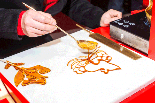 当糖画与怀旧爆米花同时出现,同台竞技。色泽鲜亮的糖画是属于童年的马良神笔。