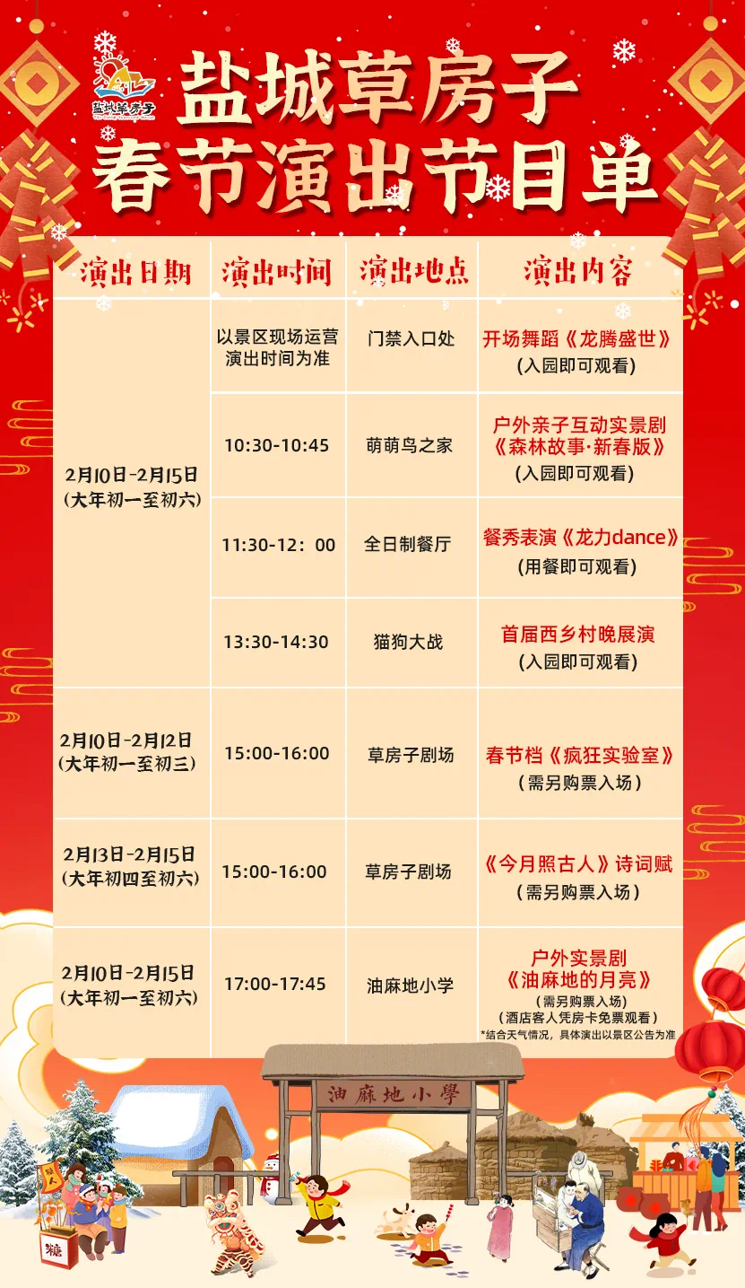 一路追着车流和人流,跨过草房子的大门。来到了猫狗大战的草坪,2000平的场地上早已挤满了人。 “灯光音响准备好了吗”?“准备好了”! “摄制组准备好了吗”?“准备好了”! “演员组准备好了吗”?“准备好了”! 随着一声令下,我们的村晚开始啦! 村晚现场,歌舞、杂技、情景剧、架子鼓等多种表演,轮番上演,让人目不暇接。油麻地代表队与草房子代表队的节目pk形式引得台下观众奋力鼓掌和大声喝彩。 更有村晚拜大年、村书记采访、西乡特产推广试吃等环节让村晚的氛围入耳入心。 不仅传递乡风年韵,还传递着新时代乡村振兴的蓬勃气象,撑起了大家的精神支柱和文化生活,让人直呼“这趟没白来”。 人在草房子,爱上村晚大联欢! ... 02 好戏连台,年味拉满 新的一年,来欣赏全新的草房子新年演艺。每一场演出都早早有小观众们在台下等候,互动式演艺让每一个人都成为我们故事的主角。 春节期间草房子推出了多台创新创意演出节目和新年特别版经典剧作。全方位呈现文学活化转化的魅力和浓浓祝福,要你好看! 从天亮看到天黑,再现文学美学魅力,夜游看《油麻地的月亮》演艺升级,开启狂欢闹春时刻。 多场节目限时助阵,快来贴贴,沾沾新年好运气。 新年有新景,万事皆如意。在草房子,春节假日的欢乐燃动人心,演出时间表快收好。 ... 03 烟火市集,新年好吃好玩! 烟火市集,遛娃首选,一起感受“非遗里的新年”。在传统习俗中,年画历来有着去凶辟邪、祈福迎新的寓意。 草房子精挑细选的多样化非遗摊位,都是传统文化中的独特瑰宝,逛集市,做研学,传承非遗技艺,共庆新年。 滋味盐城过大年,美食尽在草房子。自营业起,西乡美食市集人潮从未停歇,慕名前来的食客只恨胃容量不够用。 离开市集之前,手里还拎着满满当当,美食当然要分享才能双倍美味。 /// 接下来的几天 草房子里还有更多精彩活动等着你 一起来西乡看村晚,过大年吧!