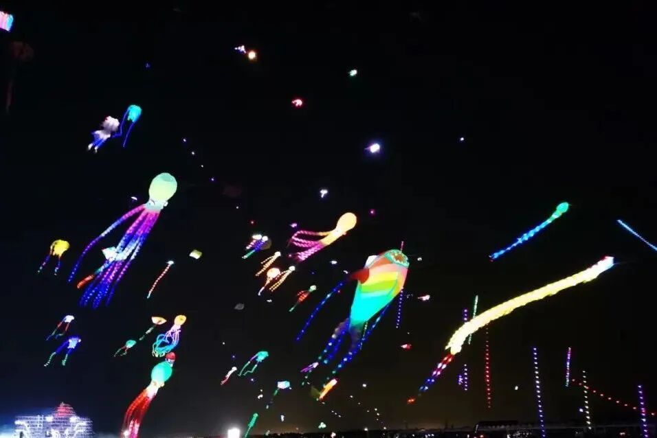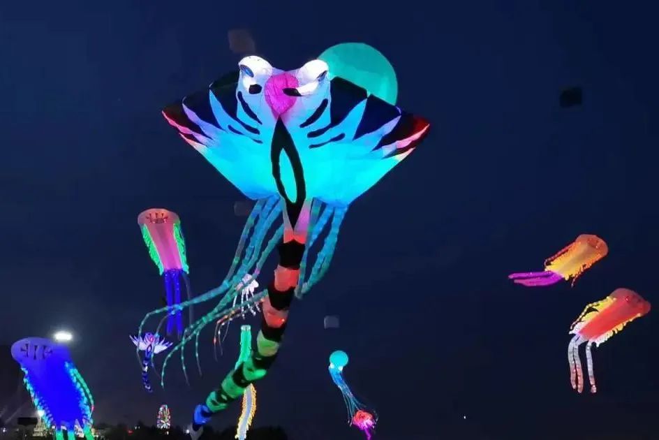 夜光风筝用美丽的霓虹光把天空渲染成彩色