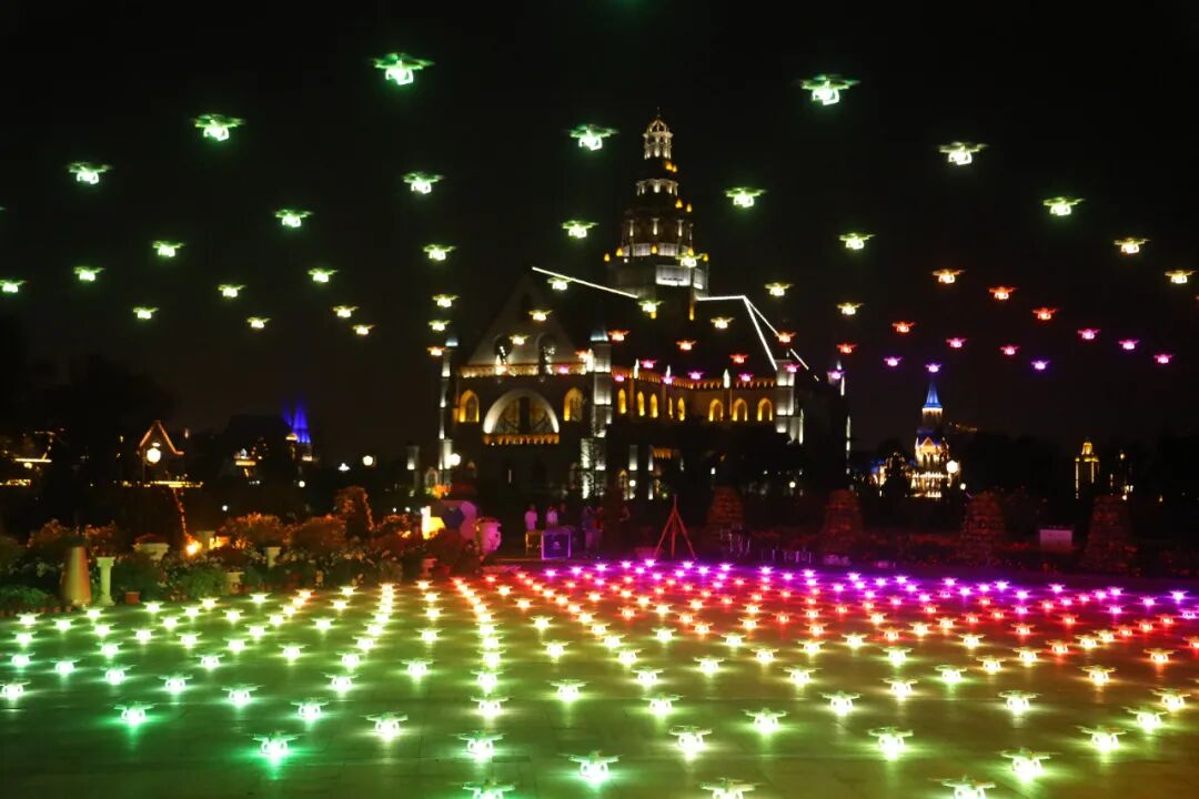 通过无人机组成许多独特造型更有一些惊奇的互动给游客带来一个全新体验