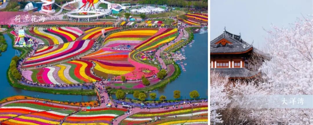 有“中国郁金香第一花海”美誉的荷兰花海,风情万种绽奇葩,芳香惹得人不归,3000万株郁金香迎风怒放,见证张謇先生实业兴国历史,传承中荷百年友谊。大洋湾万亩樱花次第开放,层层叠叠、如云似雪,梅花、牡丹、海棠五朵金花让盐城春季的多巴胺充分释放。