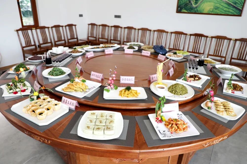 海鲈鱼蒸草鸡蛋、干菌汤配脆皮虾、黄沙港钓带鱼、西兰花酿虾茸、鮟鱇鱼圆、松仁烤鳗、芙蓉蟹豆腐。